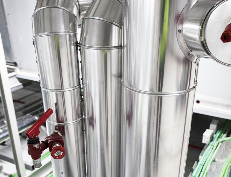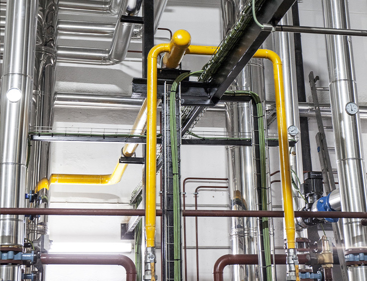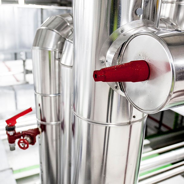 Fabricamos en nuestras propias instalaciones aislamientos acabados en aluminio y en acero inoxidable. Los transportamos y montamos in situ sobre el sistema de tuberías.